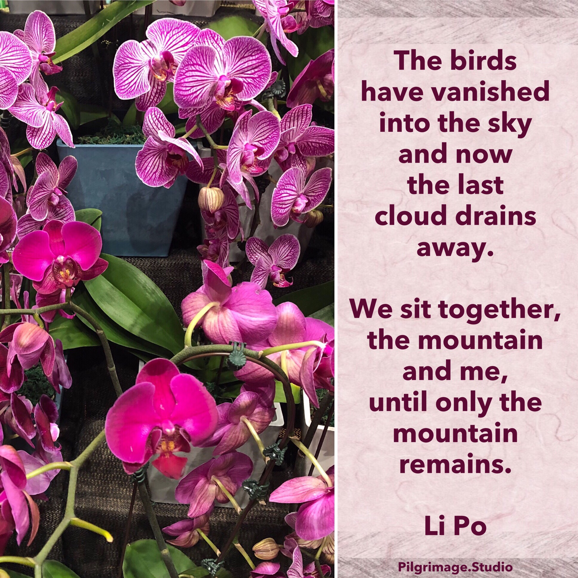 The birds have vanished into the sky and now the last cloud drains away. We sit together, the mountain and me, until only the mountain remains. –Li Po