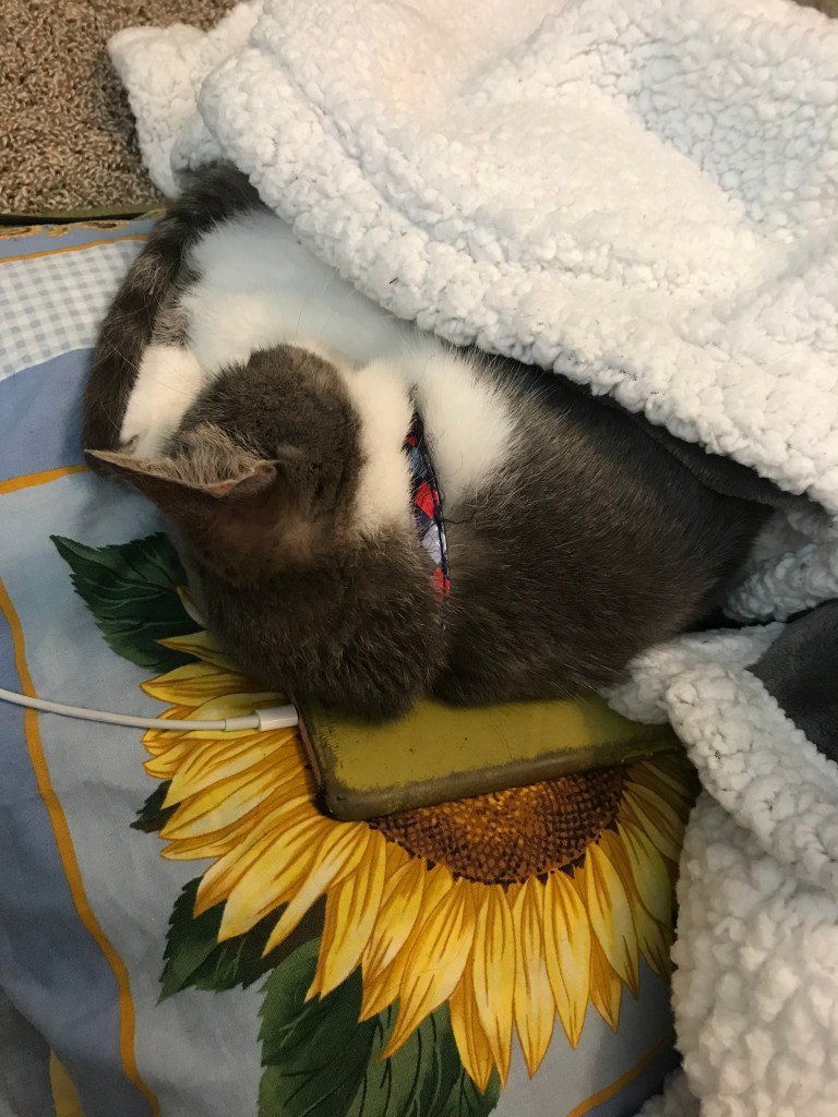 But today, when I looked over, I was surprised to see Patsy: she wasn’t laying close to the phone…she had positioned her body so that she was laying on it. The music I was playing is a Solfeggio soundtrack with the frequency of 741HZ called Dissolve Toxins and Cleanse Infections by Meditative Mind.